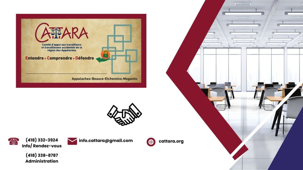 L’équipe de CATTARA veille à fournir un soutien aux victimes de lésions professionnelles afin de favoriser leur réadaptation sociale, en leur fournissant appuis, informations, conseils et accompagnement pour qu’ils puisent obtenir leur droit de compensation établi selon la Loi sur les accidents du travail et les maladies professionnelles.