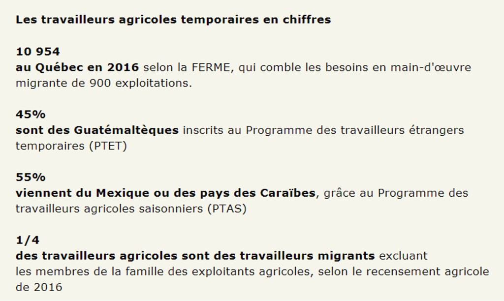 La pénurie de main-d’oeuvre agricole un peu partout au Québec a fait en sorte que de plus en plus de travailleurs migrants -particulièrement du Sud- passent leurs étés dans nos champs. Des travailleurs qui, théoriquement, bénéficient des mêmes droits que tous les autres travailleurs, en matière de santé et sécurité. Or, la réalité est parfois bien différente et peut laisser un goût amer…