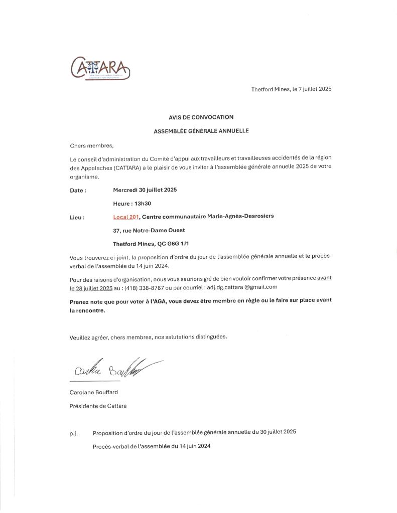 Les documents ont été envoyés par courriel ou par la poste. Pour des raisons d’organisation, nous vous saurions gré de bien vouloir confirmer votre présence avant le 28 juillet 2025 au: (418) 338-8787 ou par courriel: adj.dg.cattara@gmail.com